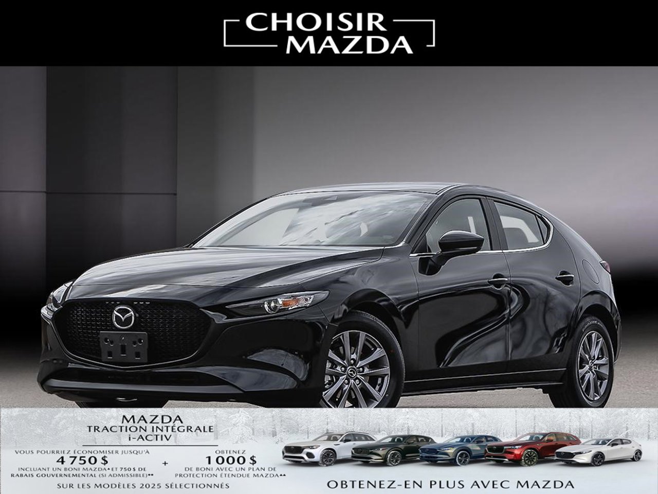 ▲A $500/$750/1,000/$4,000 Event Bonus is available on new and previously unregistered 2025 Mazda3, 2025 Mazda3 Sport/ 2025 CX-5/ 2025 CX-30, 2025 CX-90 MHEV, CX-70 MHEV/ 2025 CX-90 PHEV, 2025 CX-70 PHEV models that are purchased or financed/leased (on approved credit) and delivered between January 3 and February 2, 2026, from an authorized Mazda retailer in Canada. Bonus will be applied to the negotiated selling price of the eligible vehicle before taxes and: (i) has no cash surrender or other value; (ii) does not apply to fleet sales; and (iii) cannot be applied to past transactions. Conditions apply. See mazda.ca or your local Mazda Retailer for details.